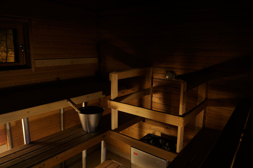 Tilavaan saunaan mahtuu noin neljätoista henkeä nauttimaan lempeistä löylyistä. Suihkuja pesutilassa on kolme kappaletta.